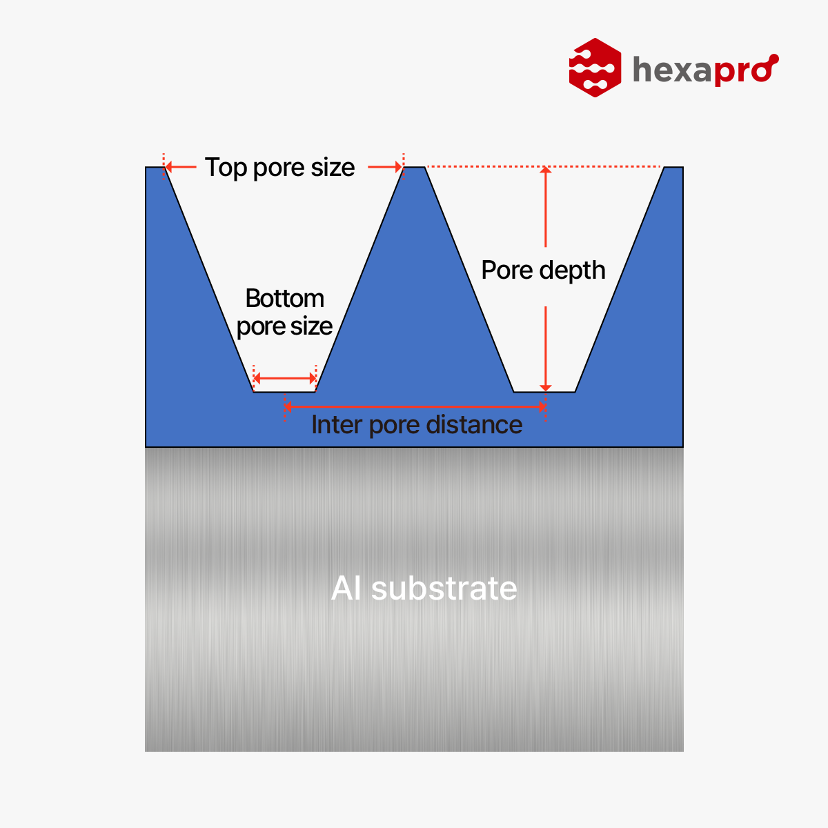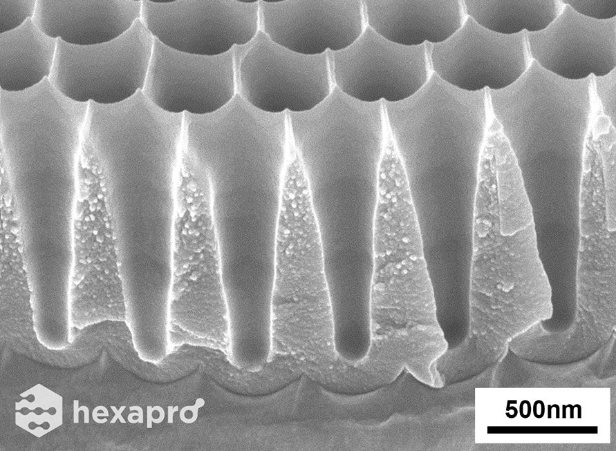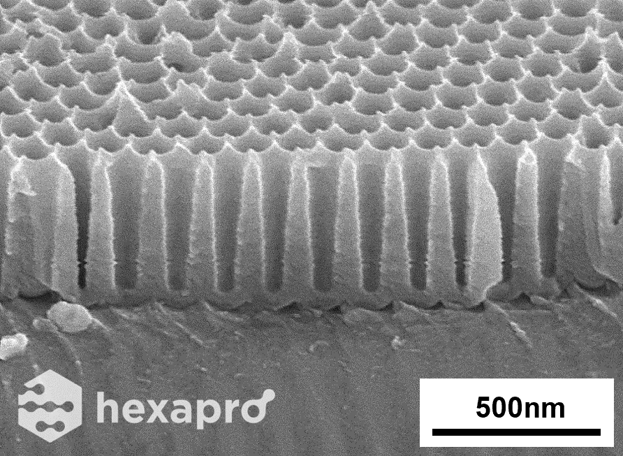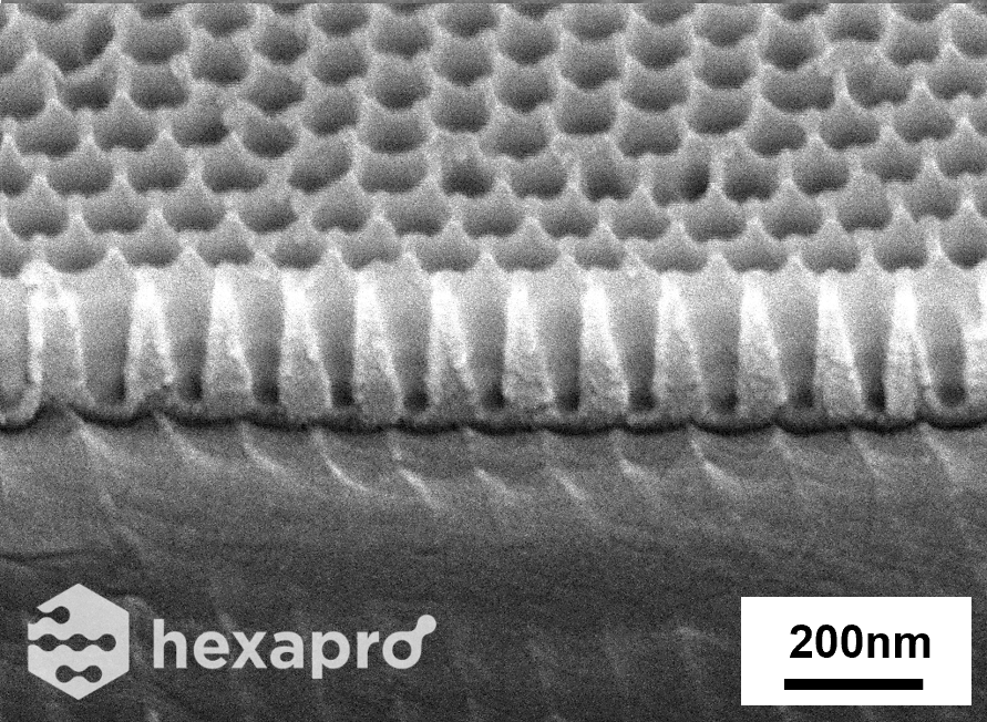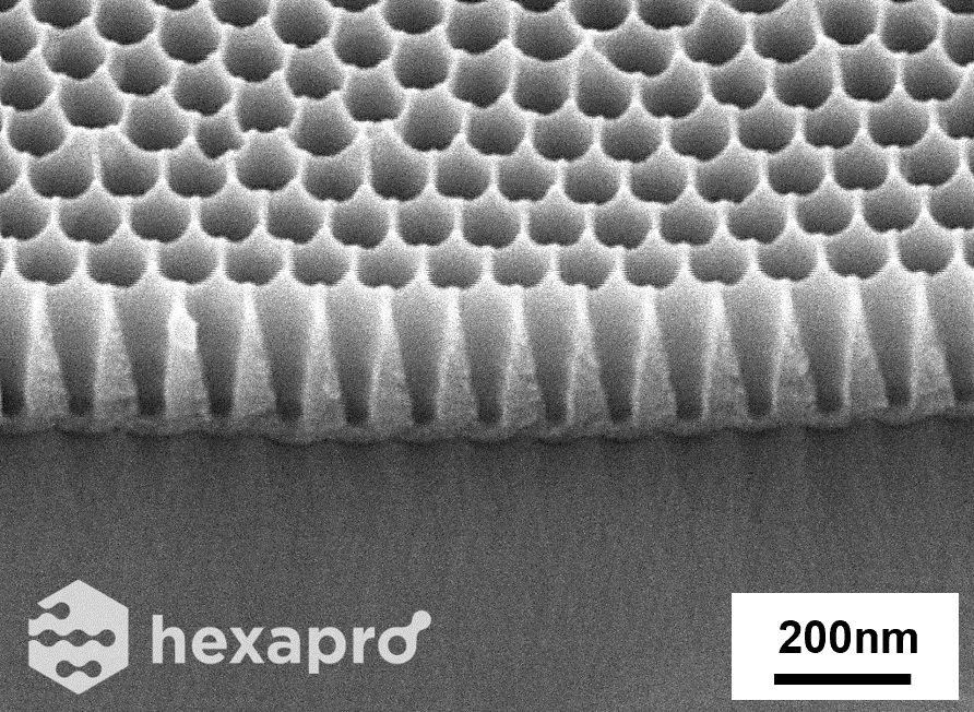 V-shaped AAO on Al manufactured using Hexapro’s exclusive anodizing technology.